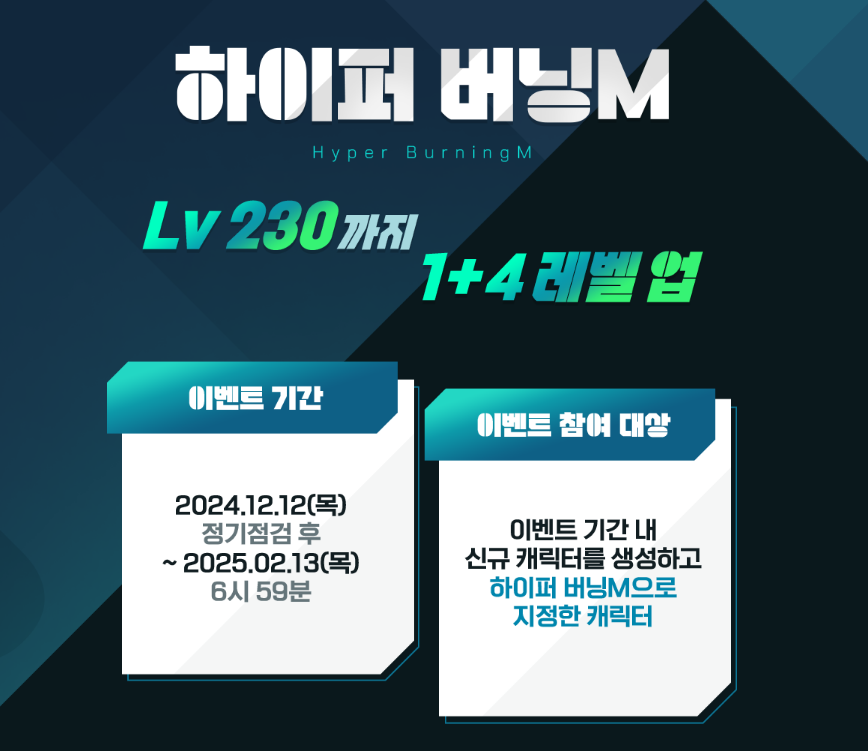 - 보상: 하이퍼 버닝 부스터로 100레벨부터 230레벨까지 빠르게 레벨업 가능!