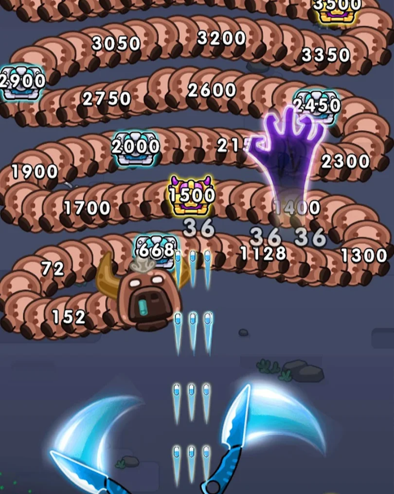게임의 목표는 몸통이 여러 개 이어진 바이러스를 모두 처치하는 것입니다. 이 바이러스의 몸통에는 숫자가 적혀 있는데, 이는 해당 부위의 체력을 의미합니다. 이 몸통들을 파괴하다 보면 보물 상자 아이콘이 그려진 몸통을 발견하게 됩니다. 이 보물 상자를 파괴하면 무작위로 새로운 스킬을 획득하거나 기존 스킬을 강화할 수 있습니다.