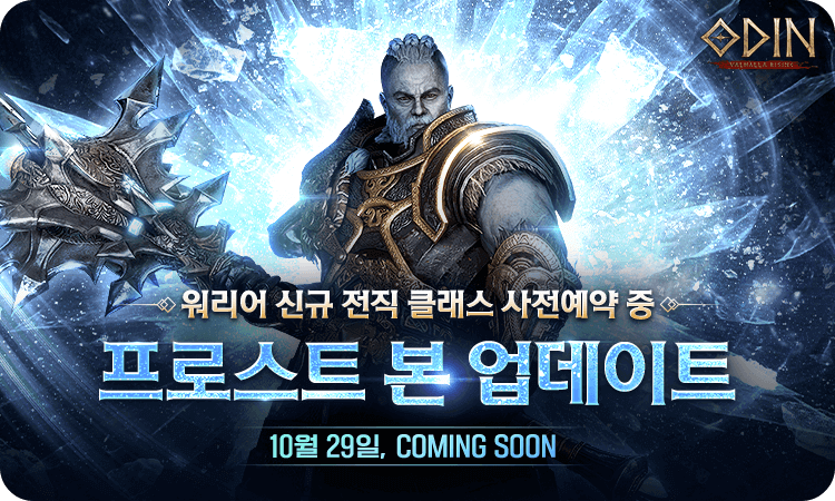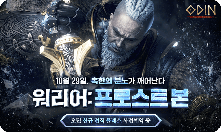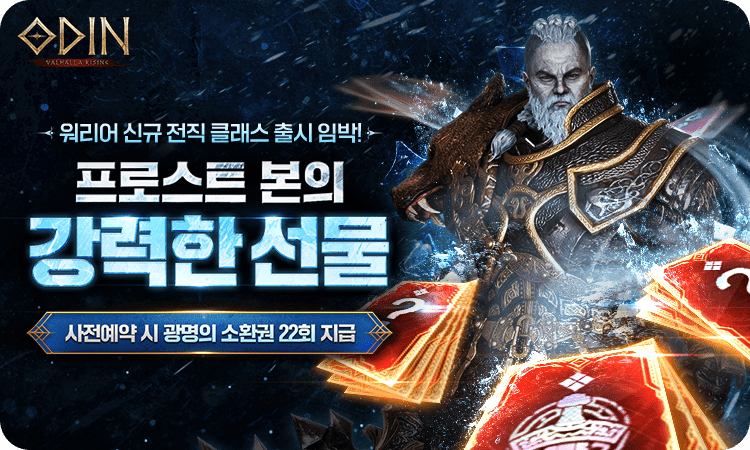 오딘: 발할라 라이징의 밀레시안 여러분, 전장의 판도를 뒤엎을 강력한 신규 클래스가 드디어 공개되었습니다! 워리어 계열의 새로운 전직 클래스 프로스트 본이 혹한의 힘을 품고 에인헤랴르의 전장에 등장할 예정입니다.
