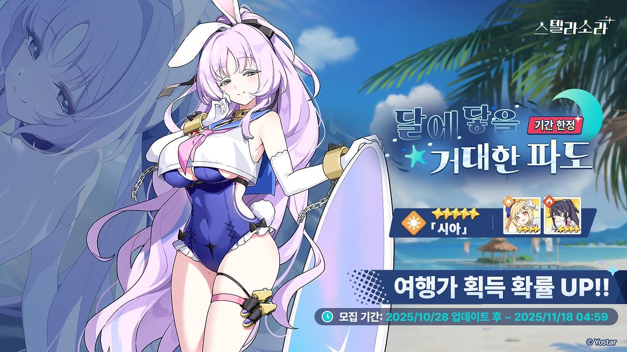 획득 방법: 시아는 11월 18일까지 진행되는 한정 이벤트 달에 닿을 거대한 파도에서 만나볼 수 있으며, 이벤트 기간 동안 시아의 모집 확률이 상향됩니다. 특히, 최초 120회 모집 시에는 시아를 1회 추가로 확정 획득할 수 있는 혜택이 제공되어 유저들의 기대를 모으고 있습니다.