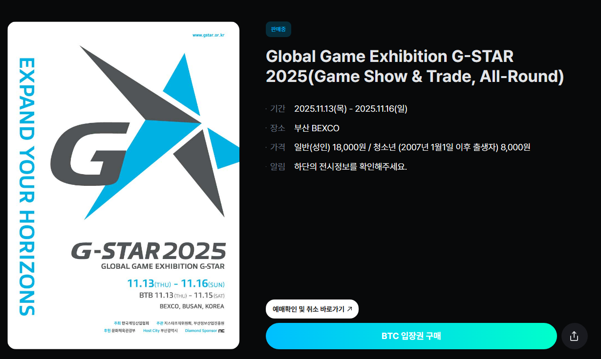 올해 지스타 2025는 11월 13일(목)부터 16일(일)까지, 부산 벡스코에서 4일간 진행됩니다. BTC(일반 관람객 전시)와 BTB(비즈니스 미팅)으로 구분되어 운영되며, 올해 메인 스폰서는 NC소프트입니다. 슬로건은 “게임, 그 이상의 경험”, 이름 그대로 게임 이상의 즐거움을 준비 중이라고 하네요.