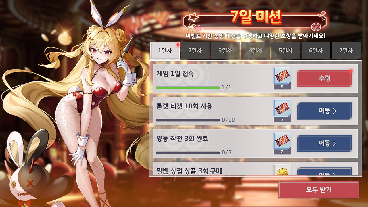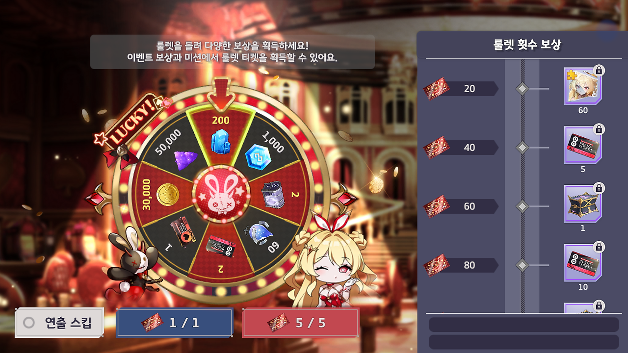 이번 외전은 화려한 카지노 무대를 배경으로 한 이벤트로, 출석 체크, 7일 미션, 이벤트 스테이지, 룰렛 등 다양한 콘텐츠가 준비되어 있습니다.