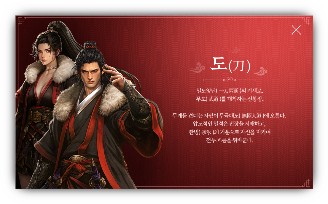 도: 강력한 일격의 위력을 자랑하며, 순간적인 폭발력으로 전장을 지배하는 선봉장 타입입니다.