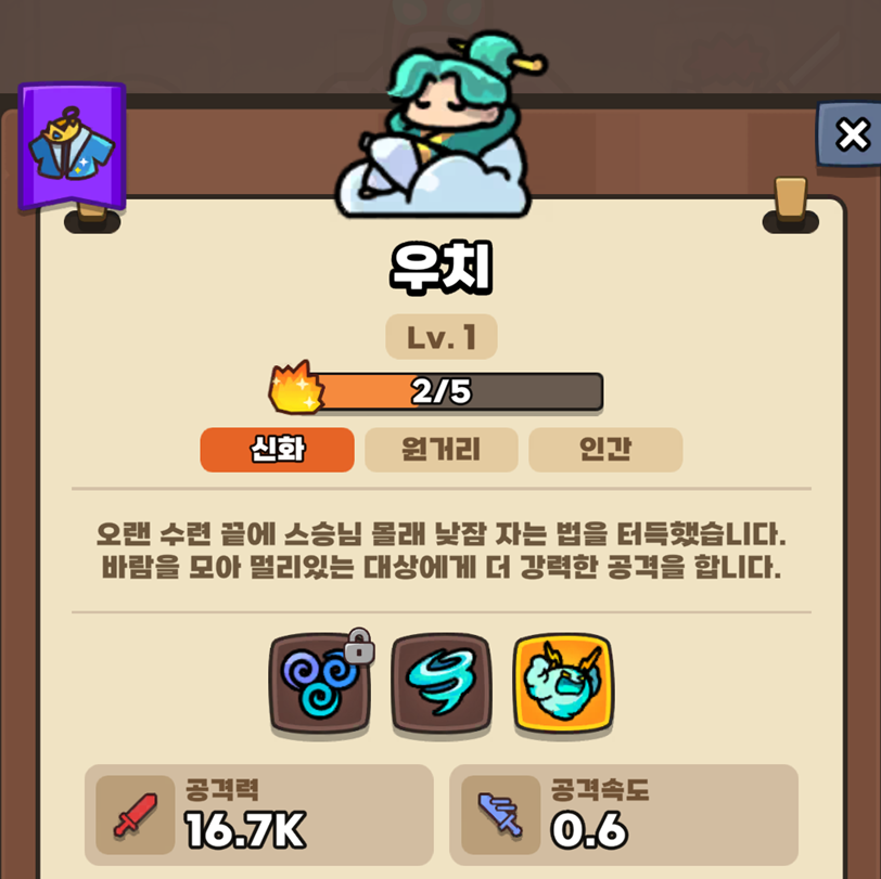 우치: 불멸 캐릭터가 아님에도 불구하고 0티어급으로 인정받는 핵심 딜러입니다. 긴 사거리와 높은 계수의 스킬로 꾸준한 깡딜과 라인 클리어 능력을 보여줍니다. 뉴비라면 최소 12레벨 이상 육성을 강력 추천하며, 전용 보물을 갖춰주면 성능이 더욱 상승합니다.