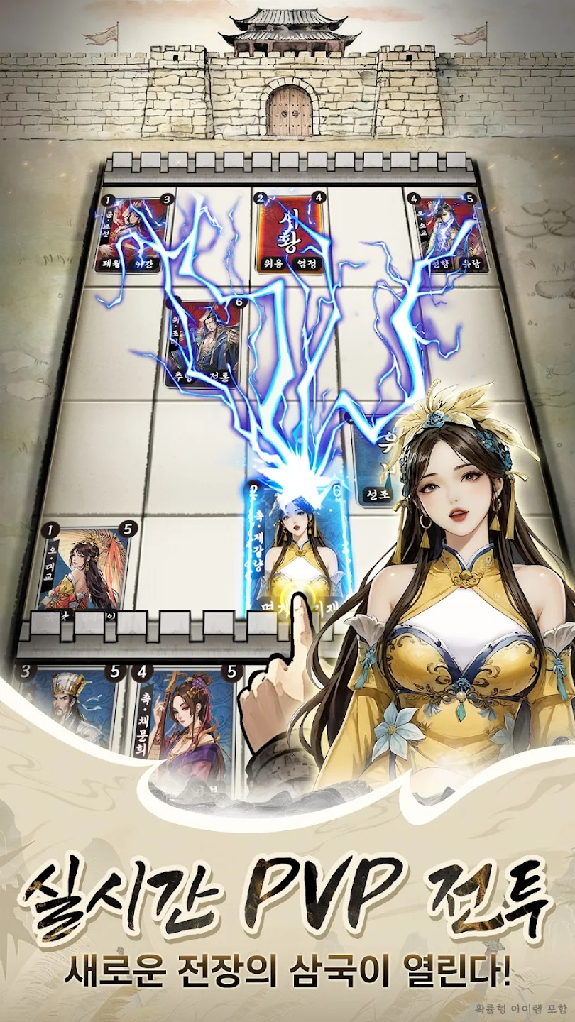 특징 일반적인 삼국지 게임과 달리 턴제 PVP 전략에 집중한 게임입니다. 판당 시간이 3분 내외로 짧아 빠른 심리전과 두뇌 싸움이 가능합니다.