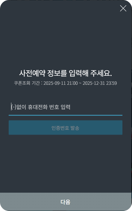 - 사전예약에 사용했던 휴대폰 번호를 입력하고 인증번호를 받습니다.