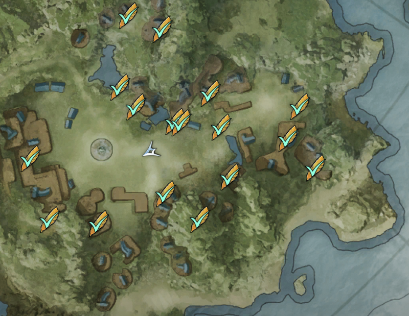 – 맵 우측 하단의 필터에서 ‘콘텐츠’를 켜두면 이미 획득한 깃털 위치가 표시됩니다.