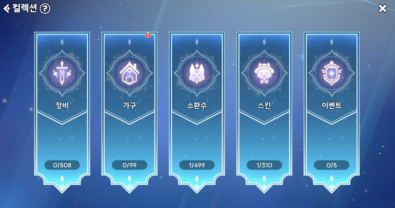 여기에는 장비, 가구, 소환수 등 다양한 요소를 등록할 수 있는데, 특히 장비 컬렉션의 경우 등록 시 장비가 사라지기 때문에 초반에 무리하게 진행하는 것을 추천드리지는 않습니다. 초보자에게 가장 효율적인 방식은 가구 중심 컬렉션 등록입니다.