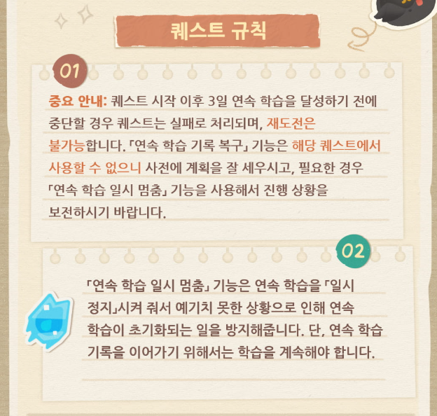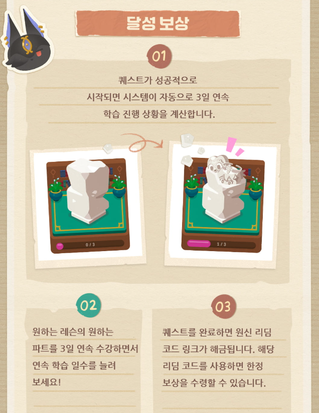 위젯 설치를 통해 매일 학습을 잊지 않고, 페이몬의 격려를 받으며 3일 연속 학습 퀘스트를 성공적으로 완료하시길 바랍니다!