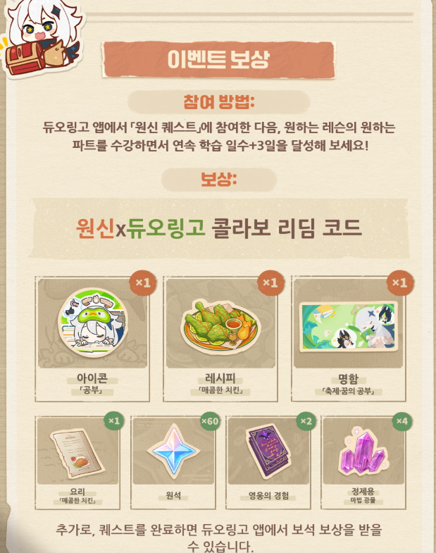 Q. 원신 듀오링고 콜라보, '3일 연속 학습 퀘스트' 참여 방법은?