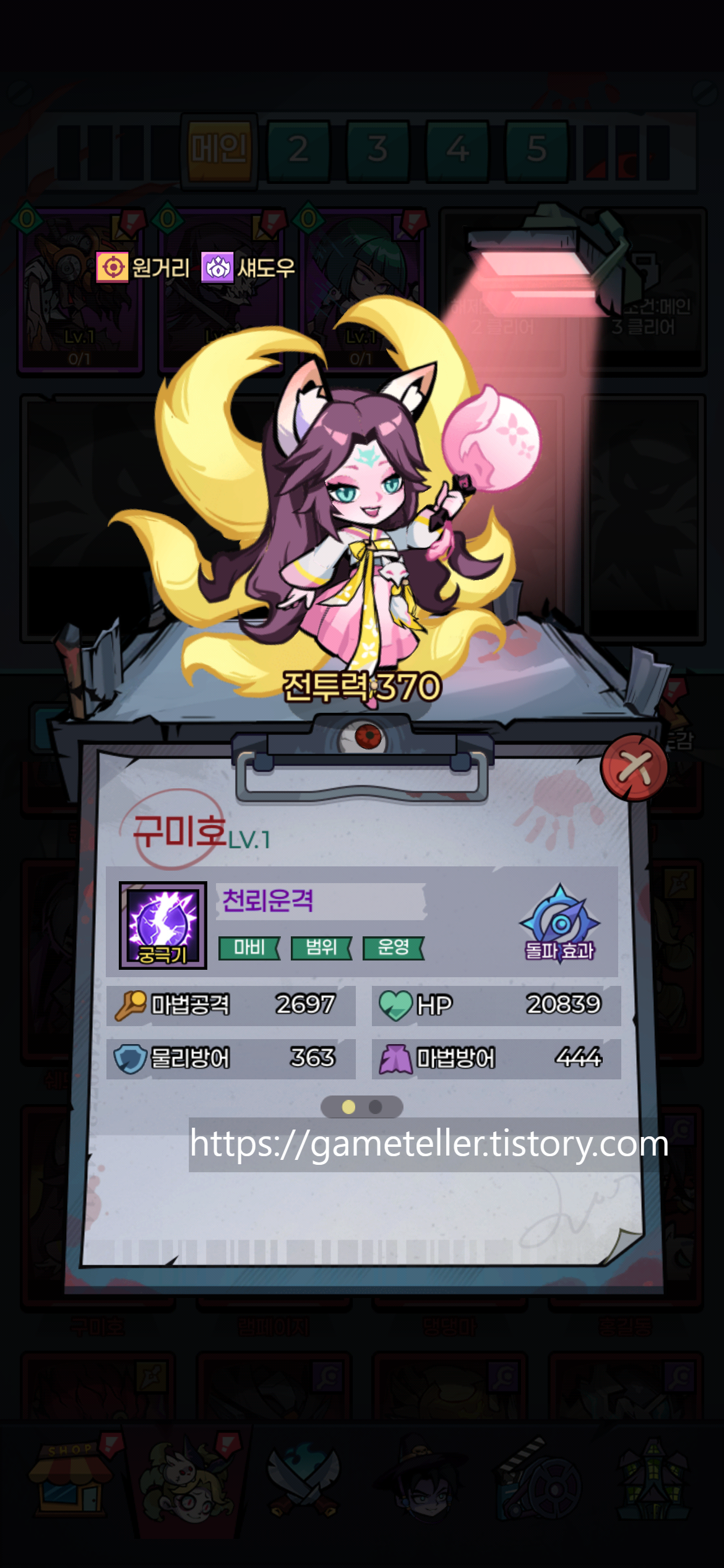 댕댕마는 대문 체력 관리에 특화된 영웅으로 메인 스테이지에서 안정성을 높여주며, 구미호는 마비 디버프와 준수한 딜링을 동시에 수행해 최근 활용도가 점점 높아지고 있습니다. 보스전과 일반 스테이지 모두 무난하게 기용할 수 있는 캐릭터입니다.
