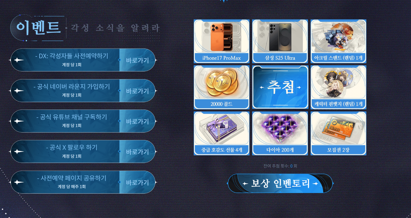 사전예약 완료 후 공식 라운지 가입, 유튜브 및 트위터 구독 등 간단한 미션을 수행하면 추첨권을 얻을 수 있습니다. 경품 라인업이 매우 화려합니다.