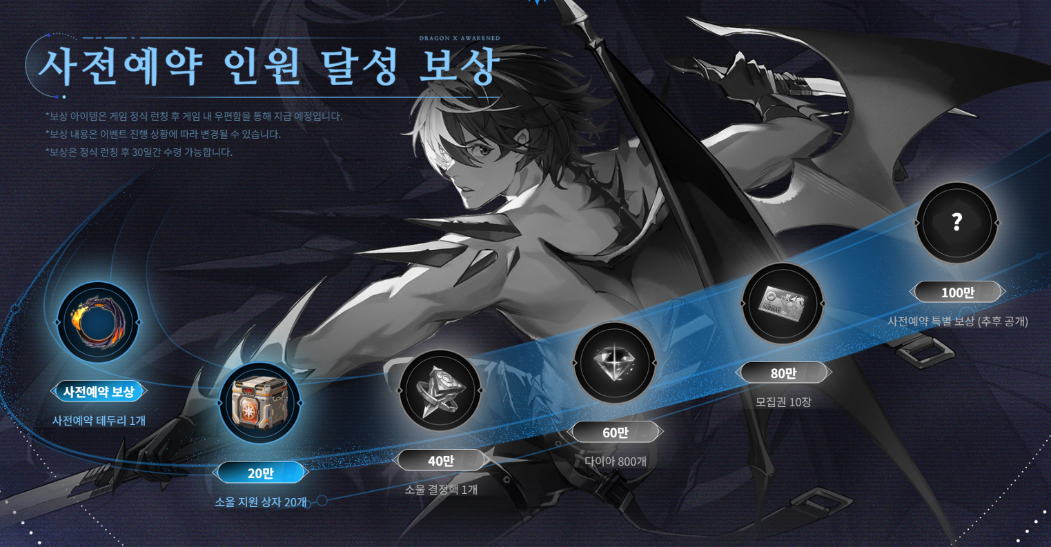 100만 명 달성 시: 사전예약 한정 테두리, 소울 지원 상자, 소울 결정핵, 다이아, 모집권 및 특별 보상 지급