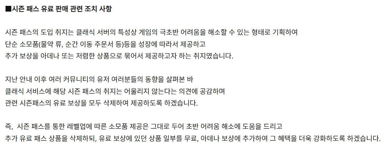 가장 화제가 된 부분은 바로 시즌 패스의 유료화 철회입니다. 당초 개발진은 클래식 서버 특유의 극초반 육성 난이도를 완화하기 위해 소모품과 추가 보상을 묶은 패스 상품을 준비했습니다. 하지만 클래식이라는 이름에 걸맞지 않는 유료 시스템 도입에 대해 유저들의 우려 섞인 목소리가 높았습니다.