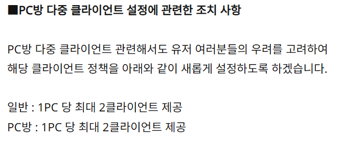 작업장 방지 및 공정한 게임 환경 조성을 위해 다중 클라이언트 정책도 새롭게 재편되었습니다. 기존에 PC방과 일반 유저 사이에서 발생할 수 있었던 형평성 논란을 사전에 차단하겠다는 의지가 엿보입니다.