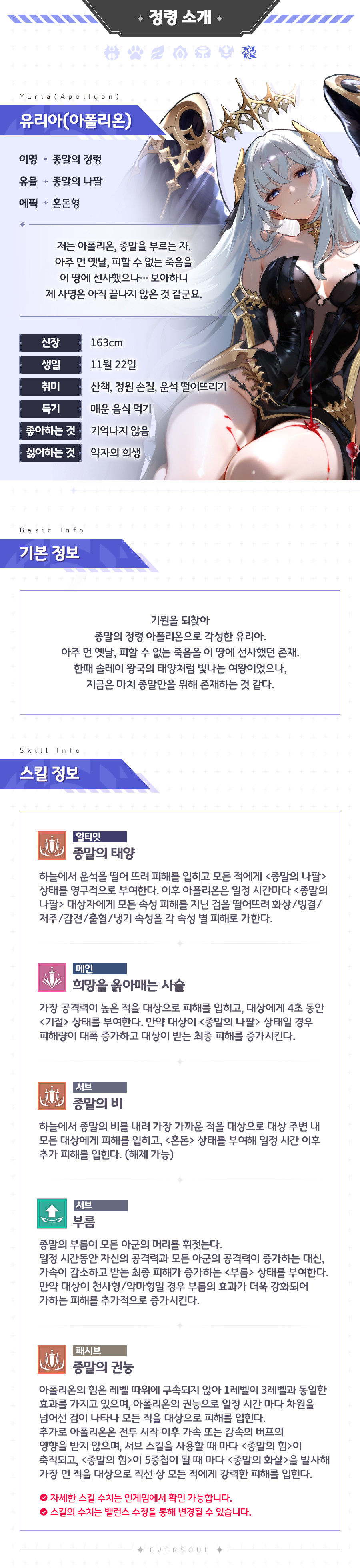 가장 큰 변화는 신규 정령 ‘유리아(아폴리온)’의 등장이다. 기존 유리아가 종말의 정령으로 각성한 형태로, 혼돈형 캐스터 클래스에 광역 딜러 포지션을 맡는다. 유물은 전용 유물 ‘종말의 나팔’을 사용하며, 전체적으로 상태 이상과 속성 복합 피해에 특화된 설계가 돋보인다.