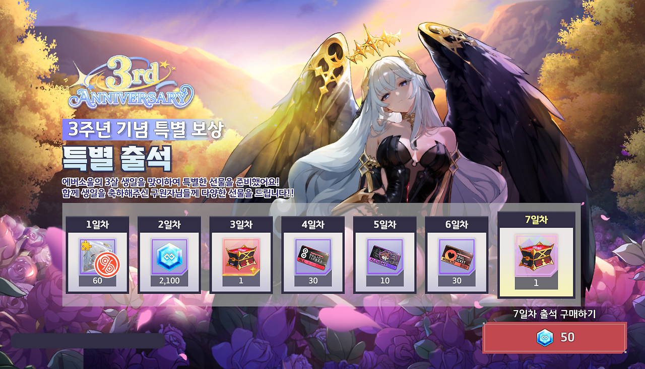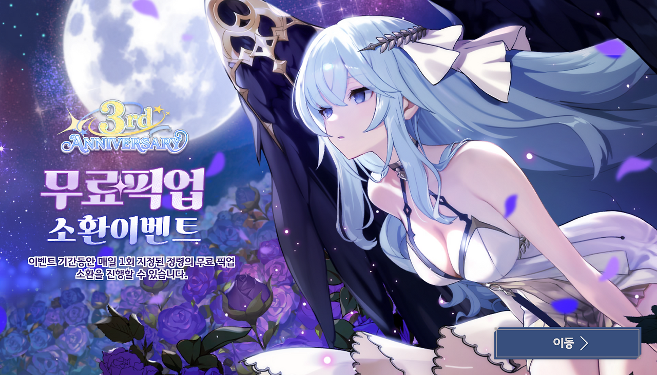 3주년 기념 이벤트 규모도 상당하다. 가장 눈에 띄는 부분은 총 300회 무료 소환 이벤트다. 30일 동안 매일 10회 무료 소환이 제공되며, 미접속일도 최대 4일까지 누적된다. 일반 소환 전용이긴 하지만, 장기적으로 보면 신규 계정 성장에 큰 도움이 되는 구조다.