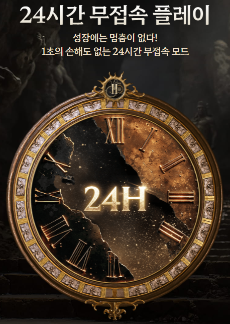 24시간 무접속 플레이: 게임을 끄고 있는 시간에도 1초의 손해 없이 성장이 지속되는 무접속 모드를 지원합니다.